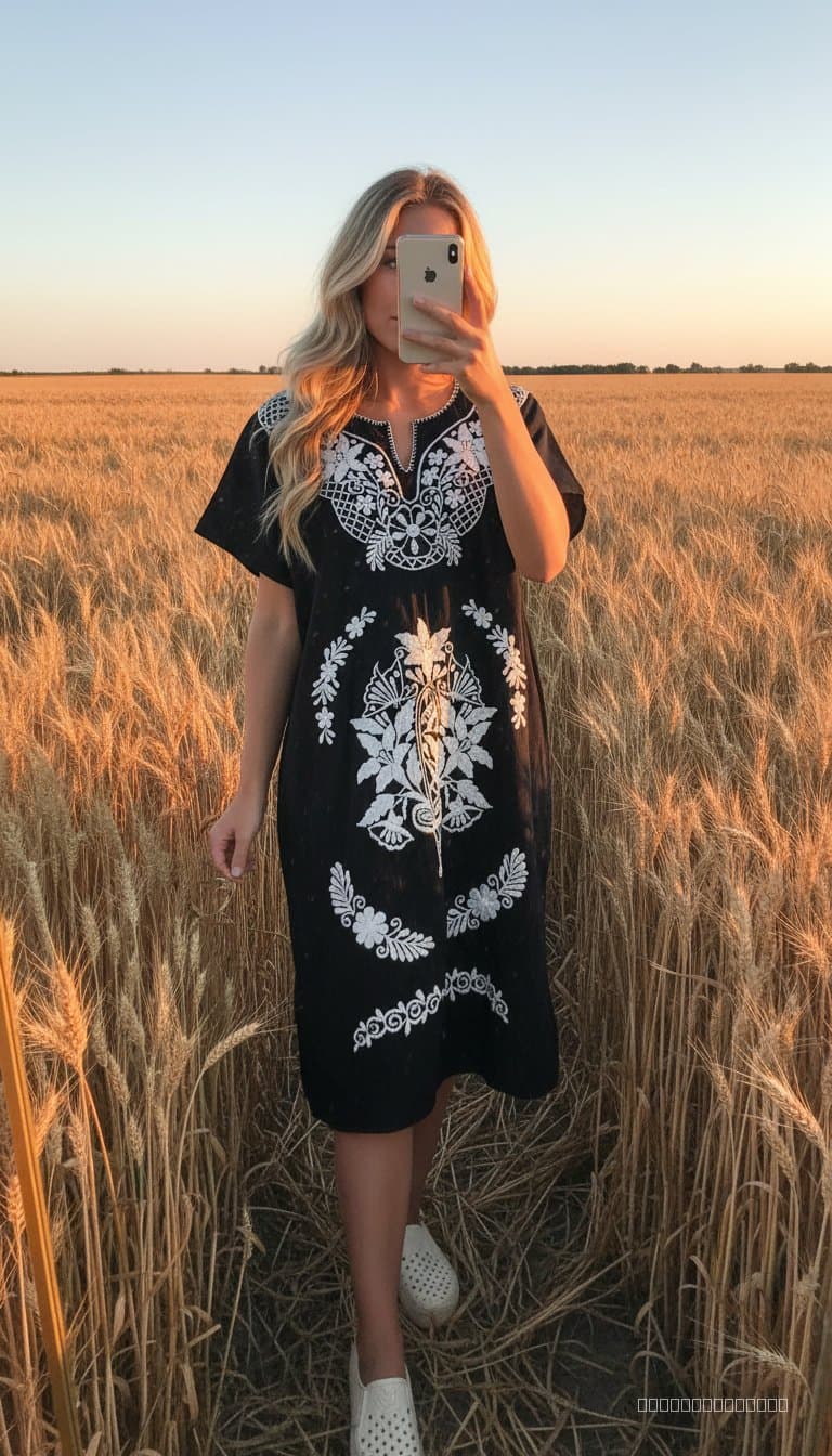 Embrace effortless elegance with this stunning black tunic dress, featuring intricate cream-colored floral embroidery. Perfect for a coastal getaway or a casual weekend look.